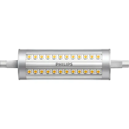 Philips Corepro LED Lineair R7s 118mm 14W 2000lm - 840 Blanc Froid | Dimmable - Équivalent 120W est une ampoule tubulaire linéaire à double extrémité. Ce type d’ampoule permet de délivrer une lumière homogène à 360° avec comme température de couleur 4000K - Blanc Froid. Cette ampoule LED R7s de chez Philips est la solution idéale pour le remplacement de vos anciennes ampoules halogènes. Cette ampoule LED n’a pas besoin de transformateur, elle fonctionne avec 230V et peut se connecter directement sur le secteur électrique.